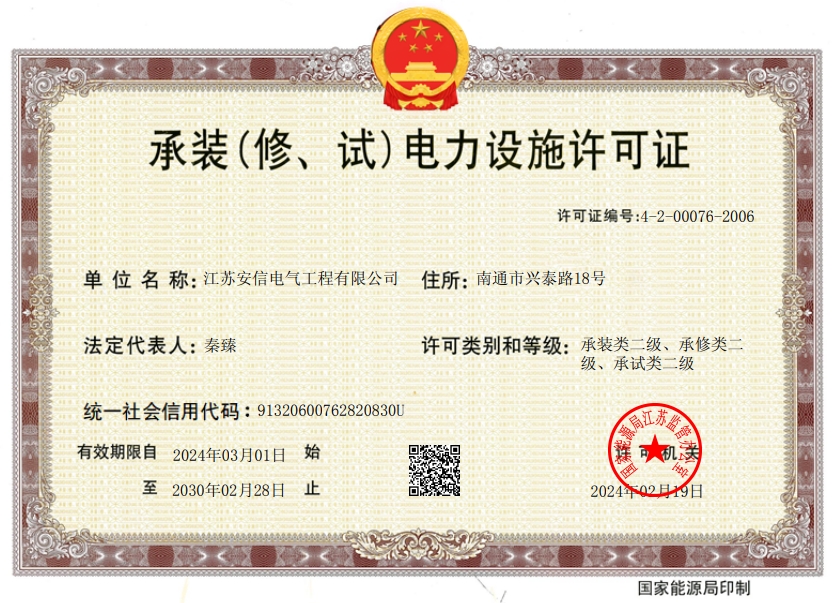 在創(chuàng)業(yè)之初,公司就堅持高起點的戰(zhàn)略思路,廣納賢才,集聚行業(yè)精英,創(chuàng)新發(fā)展,做優(yōu)企業(yè)品牌。現(xiàn)已取得:承裝二級、承修二級、承試二級,電力工程施工總承包二級,輸變電工程專業(yè)承包二級,建筑工程施工總承包二級,建筑機電安裝專業(yè)承包二級,地基基礎(chǔ)專業(yè)承包二級資質(zhì)證書,并通過了質(zhì)量、環(huán)境、職業(yè)健康和安全管理體系認證,確保各項工作有序管控。